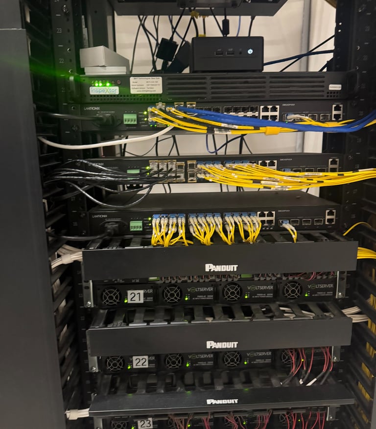 The headend consists of three 24-port Lantronix switches using fiber SFPs to distribute the network to the mini-IDF locations. Fiber was employed to provide high-speed, reliable connectivity between the lighting systems and the server. Beneath the switches, VoltServer Class 4 transmitters deliver 57V DC power to each mini-IDF switch via VoltServer receivers, ensuring consistent PoE delivery throughout the system.