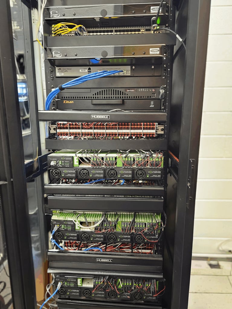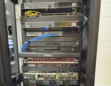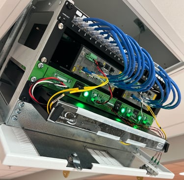 The school network is designed to be as robust as my previous projects. The headend rack includes two 48-port stackable SFP switches from Allied Telesis, complemented by a 24-port Cisco router serving as the main distribution router to the internet. VoltServer technology provides 57V DC power to each mini-IDF in the ceiling, while fiber patch panels connect the mini-IDFs to the headend for high-speed, reliable communication. Additionally, a dedicated server pools SNMP and other protocols to monitor the network, with backdoor access enabled through N-abled for streamlined management and troubleshooting.