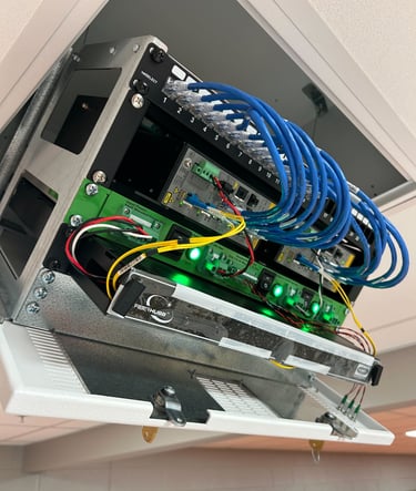 Each pair of classrooms is served by a single mini-IDF in the ceiling, housing two 8-port Allied switches that deliver 90W PoE and 10Gbps connectivity to classroom devices such as laptops and phones. Each switch also supports an access point in every classroom, ensuring full wireless coverage across the school. Additionally, each mini-IDF contains a VoltServer receiver, which converts power from the VoltServer transmitter to supply the two switches efficiently.